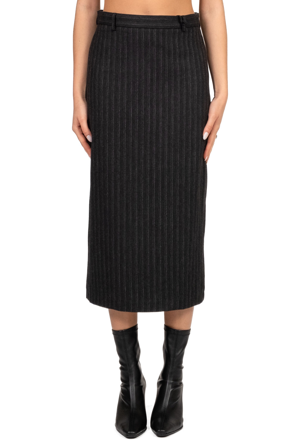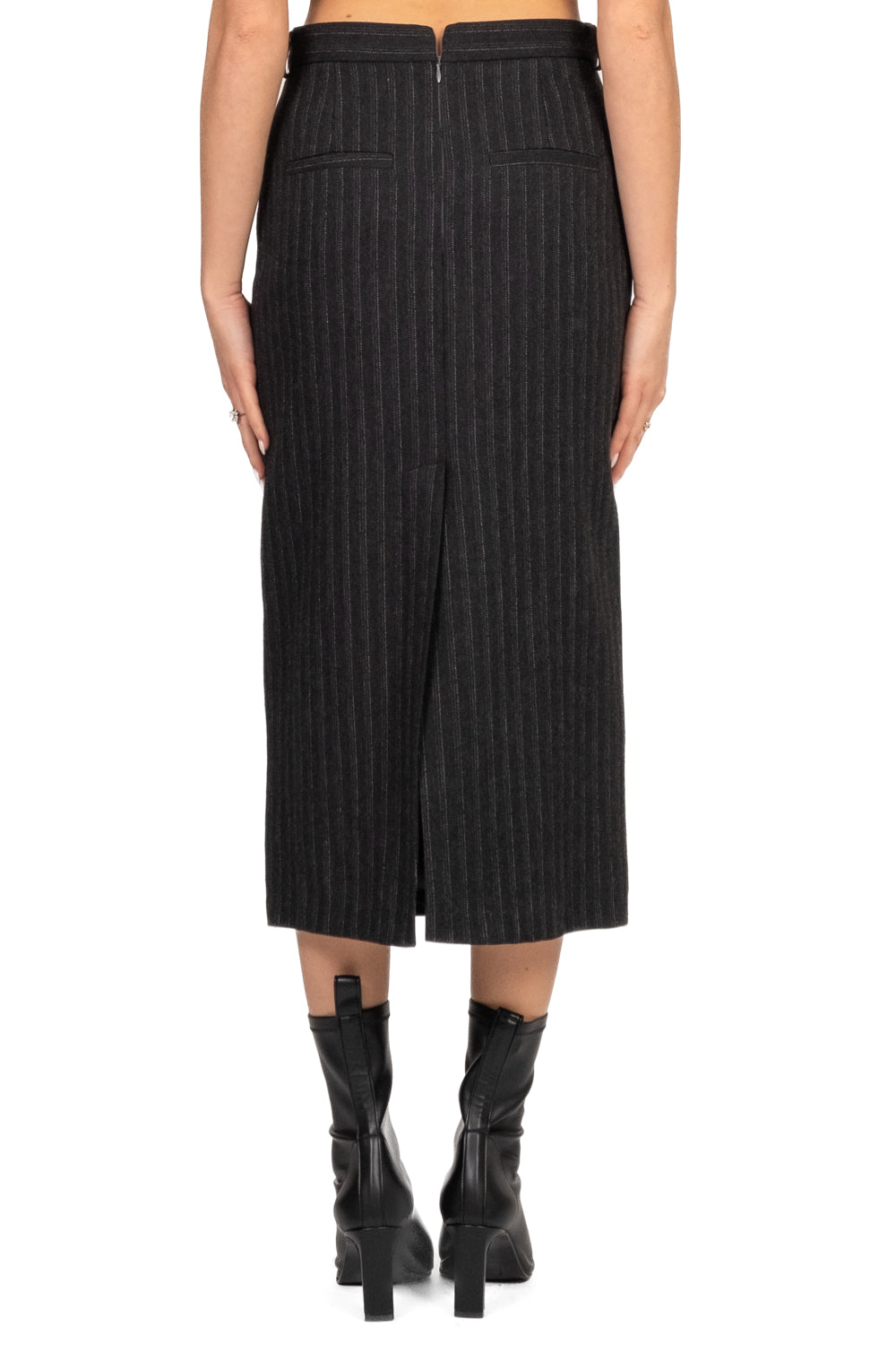 Un capo dal fascino sartoriale, questa gonna longuette in tessuto gessato unisce stile classico e dettagli moderni. La chiusura con zip garantisce una vestibilità precisa, mentre lo spacco posteriore aggiunge movimento e un tocco di sensualità discreta. Perfetta da abbinare a camicie o maglie per un look raffinato e versatile.