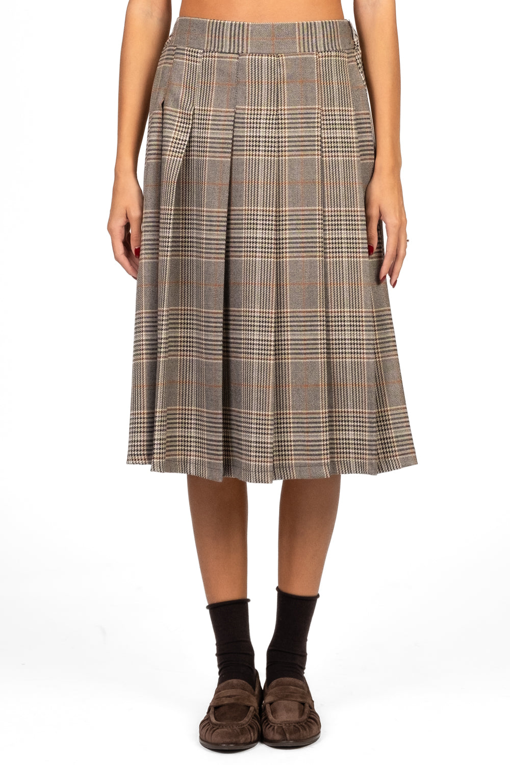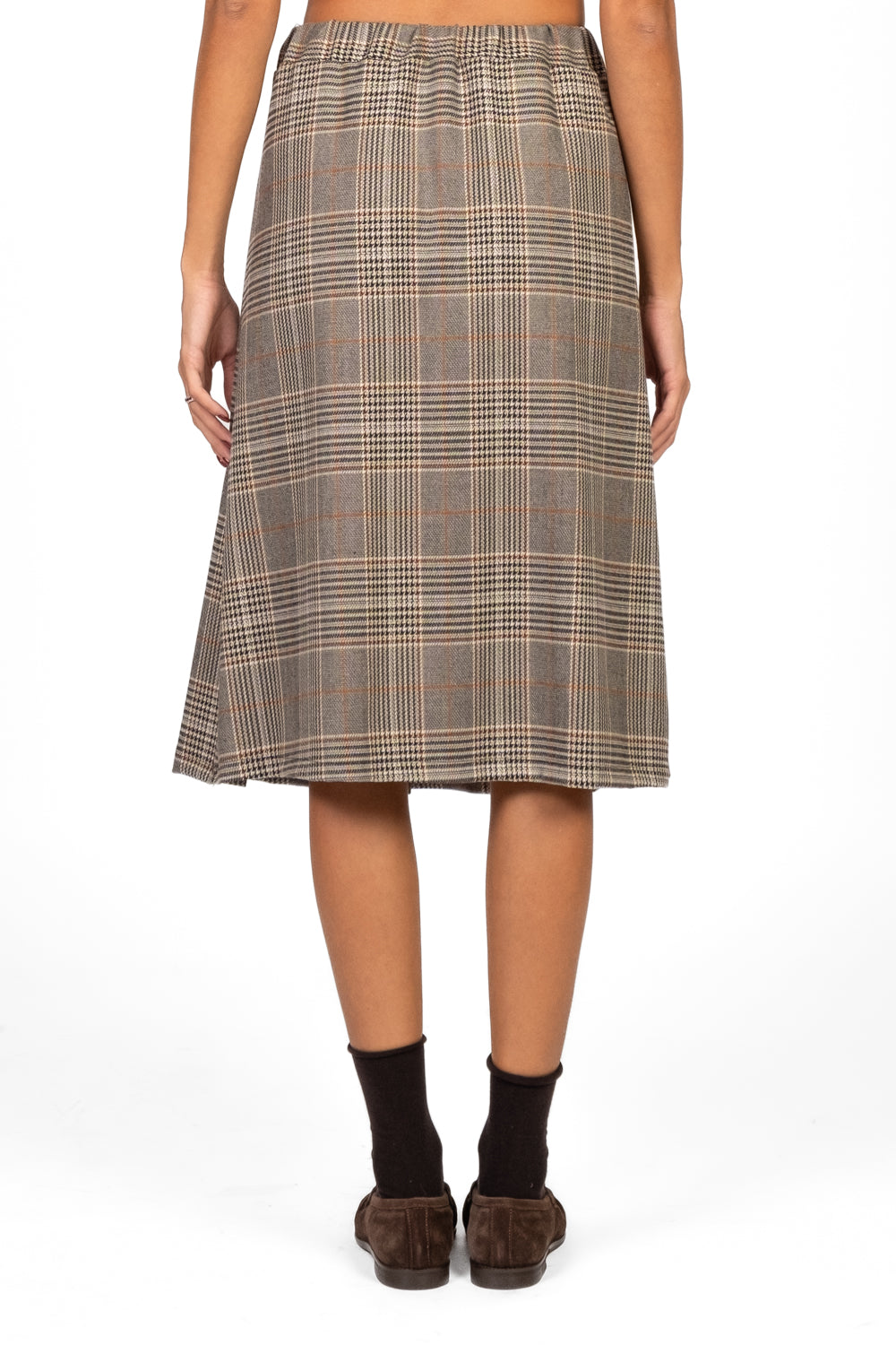 Dal fascino classico rivisitato in chiave moderna, questa gonna midi a pieghe è realizzata in tessuto check e presenta un comodo elastico sul retro per una vestibilità confortevole. Senza chiusure, facile da indossare, è perfetta per creare look versatili dal gusto preppy o casual chic.
