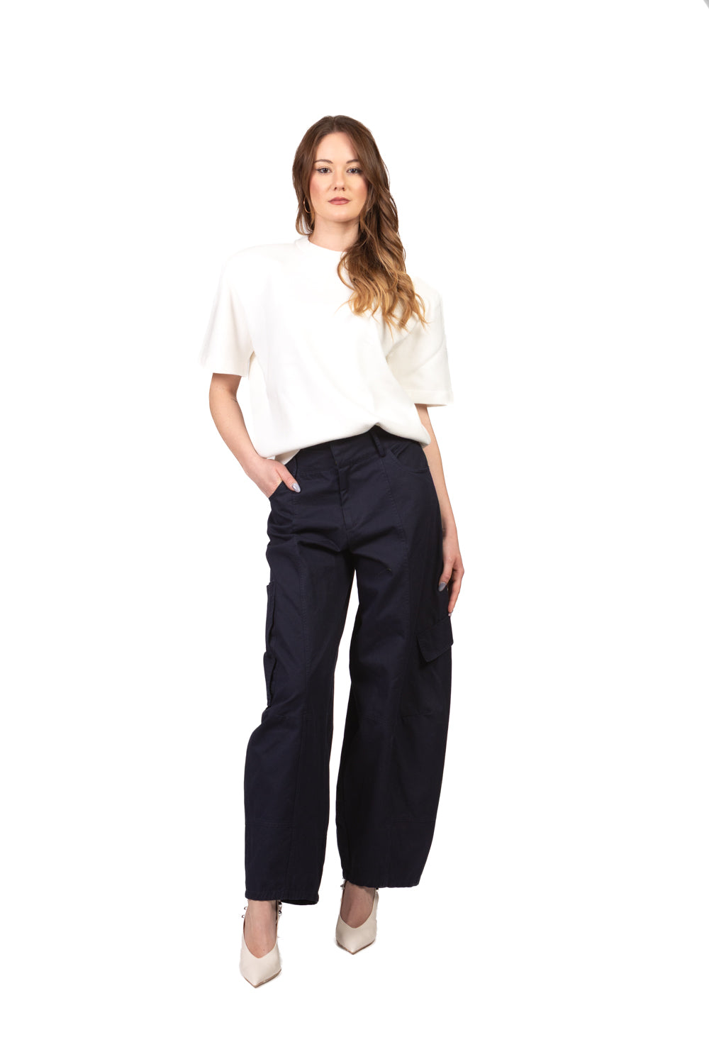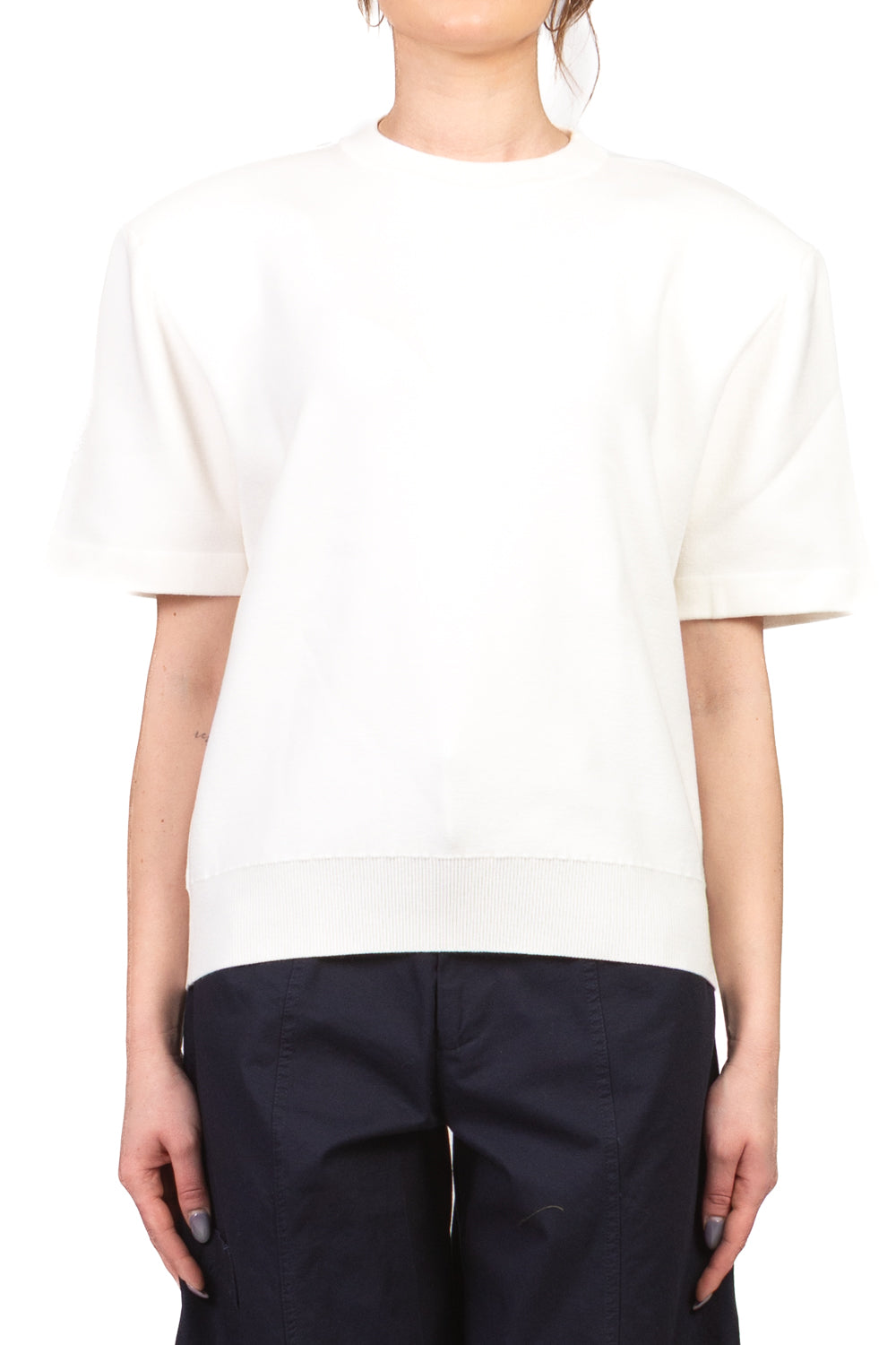 • Maglia girocollo a mezza manica dal design moderno, con spalline imbottite che conferiscono struttura e definizione alla silhouette. Versatile e di carattere, è perfetta per outfit contemporanei e dallo stile deciso.