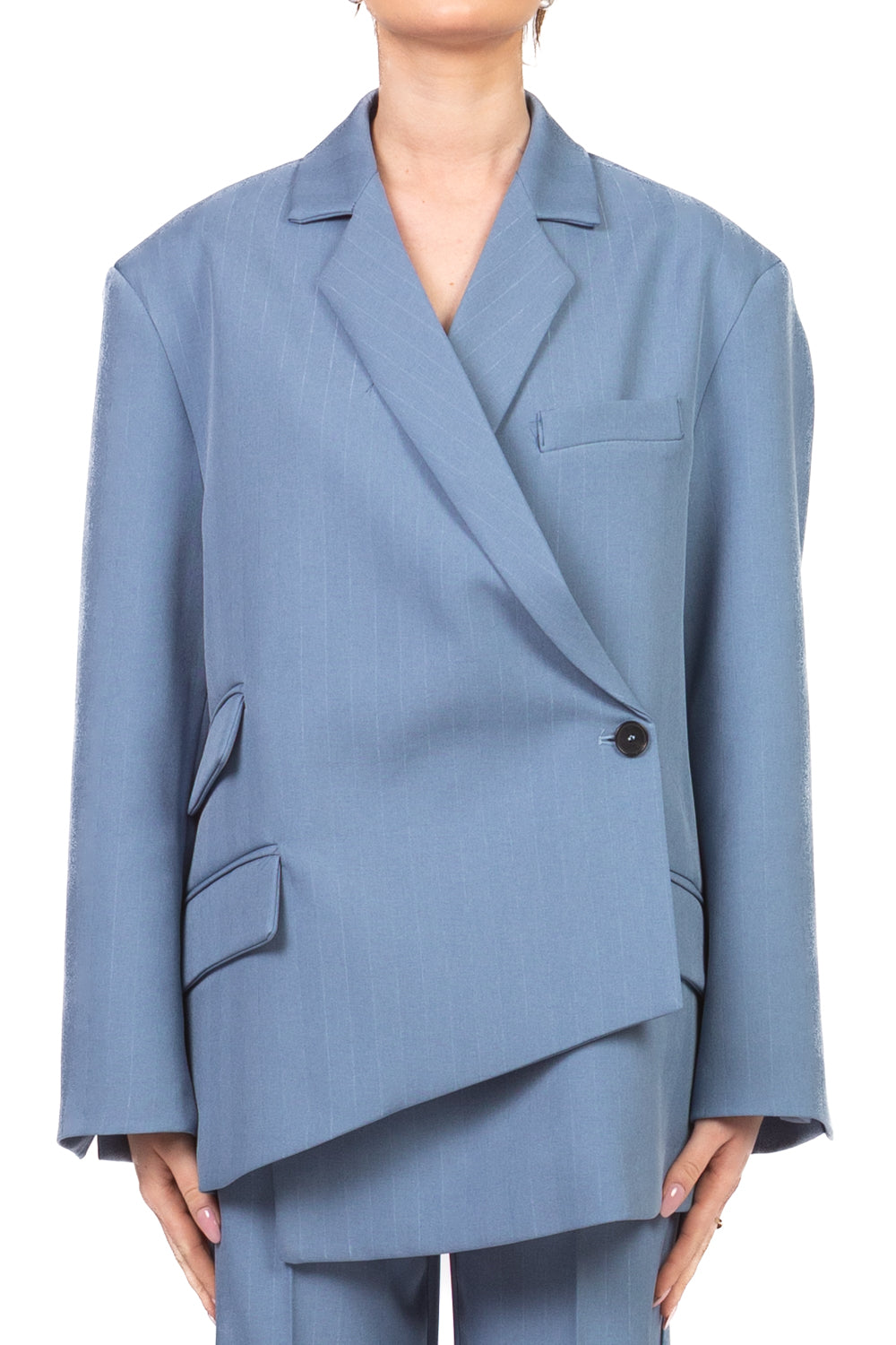 Giacca over dal design contemporaneo e deciso, caratterizzata da chiusura doppia e linea asimmetrica che dona movimento al look. Le spalle leggermente imbottite assicurano struttura, mentre tasche e taschino frontali uniscono praticità e stile. Gli spacchetti laterali completano il capo con un tocco di originalità, perfetto per outfit moderni e sofisticati.