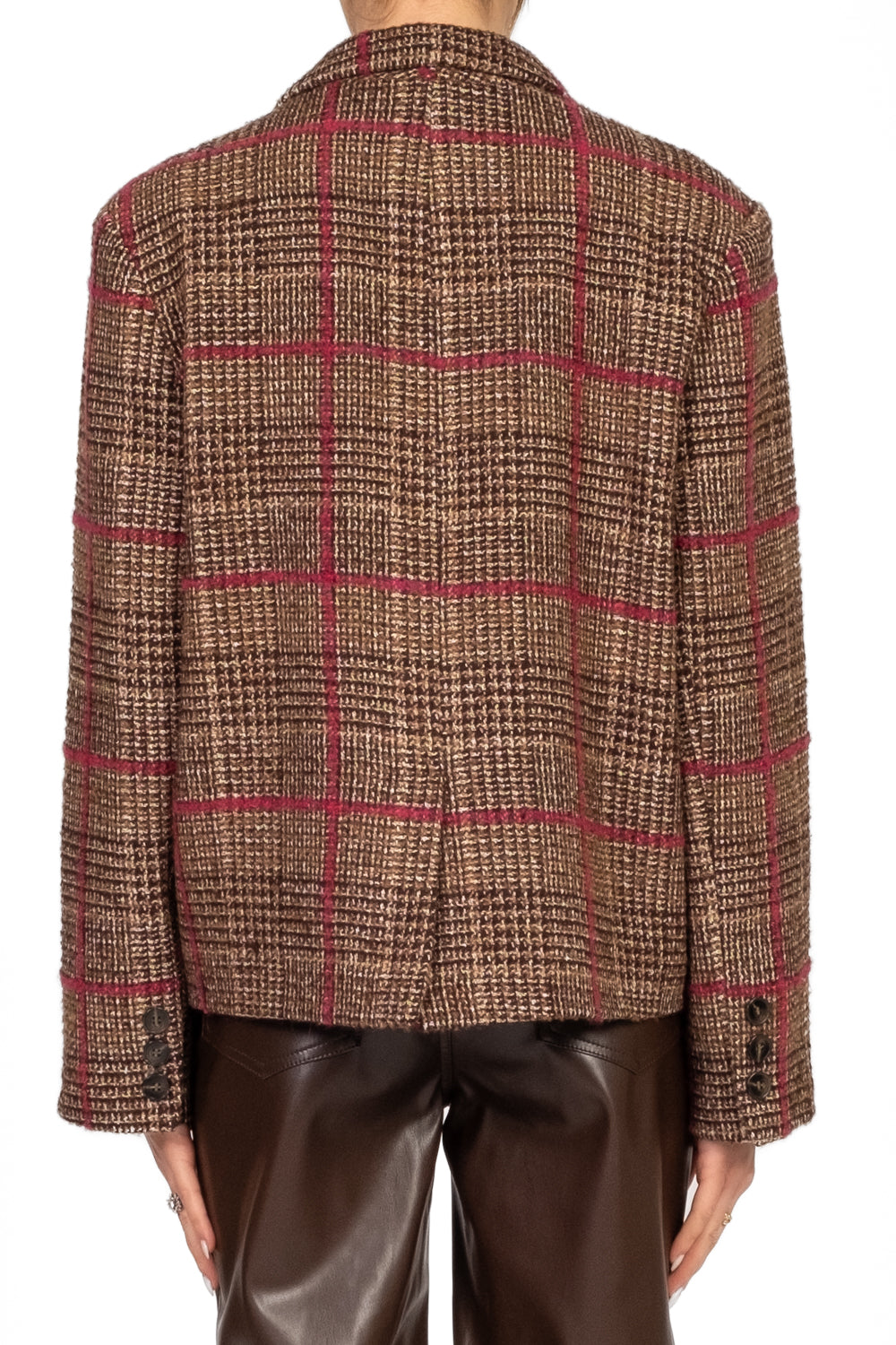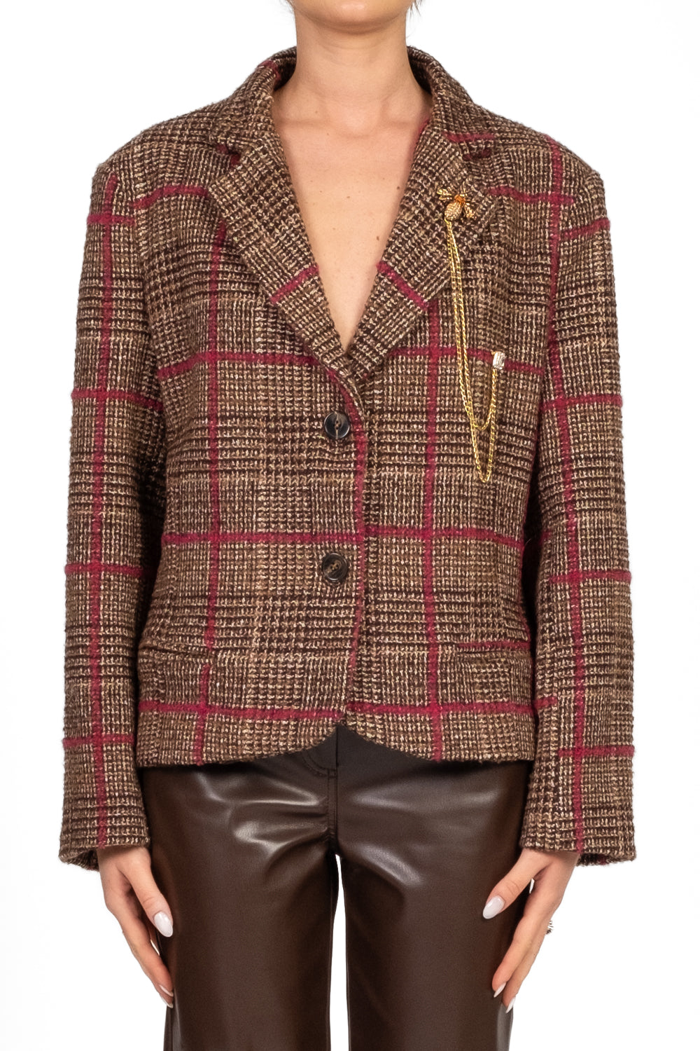 Giacca corta dal taglio strutturato con fantasia a quadri, arricchita da una spilla decorativa a catena. Spalline leggermente imbottite, chiusura a due bottoni, fodera interna e spacchetto posteriore. Le tasche frontali finte completano il design sofisticato