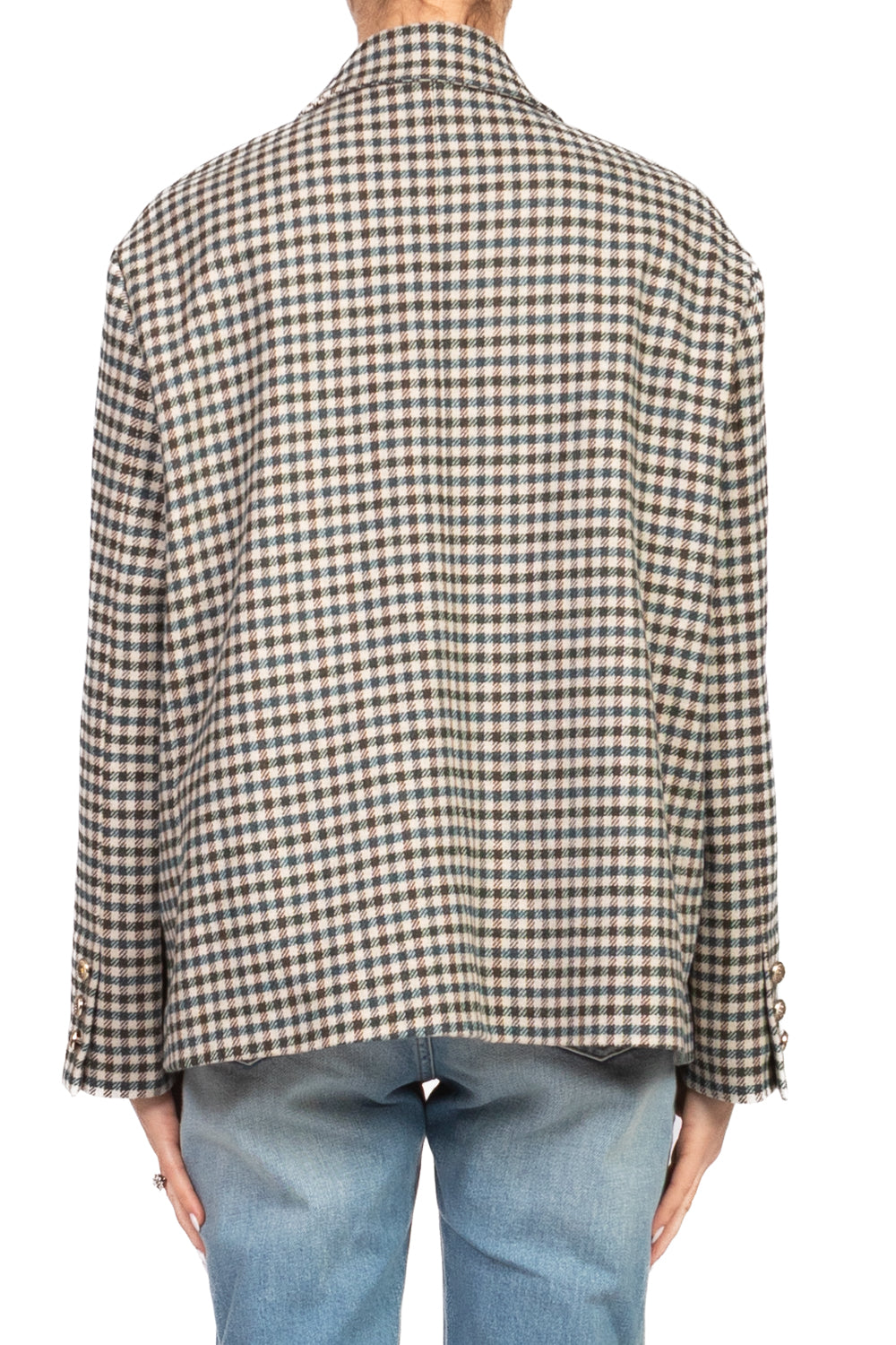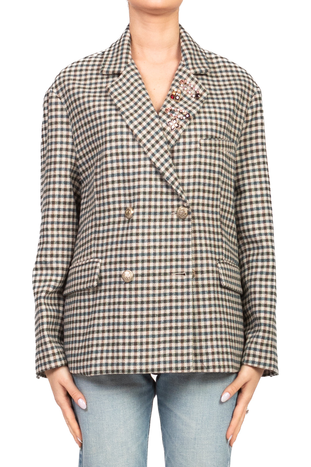 • Giacca doppiopetto a fantasia quadretti dal fit leggermente over e taglio strutturato, con spalline leggermente imbottite per una silhouette decisa. Decorata con spille applicate sul bavero e dettagli di bottoni oro, che aggiungono un tocco elegante e distintivo. Un capo dal carattere forte, perfetto per look formali ma originali.