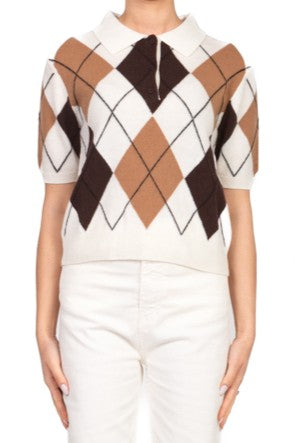 Questa maglia polo a mezza manica unisce un design classico a un tocco grafico grazie al motivo a rombi. Perfetta per un look casual-chic, offre comfort e stile in ogni occasione, dal tempo libero al lavoro.