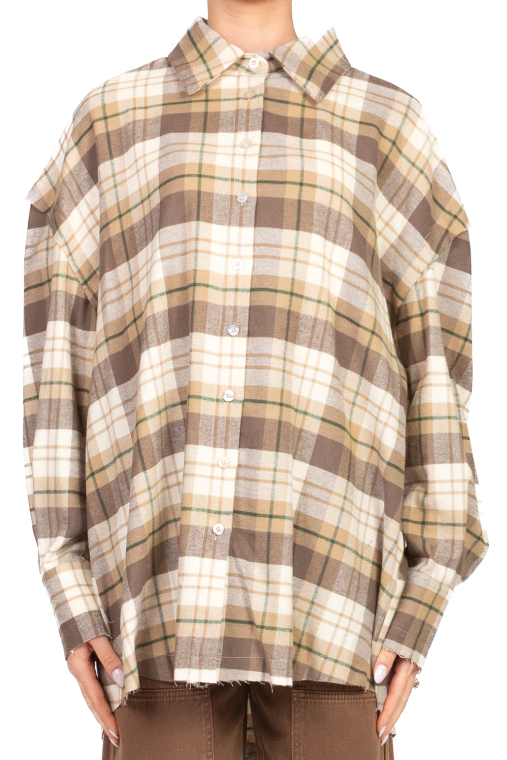 Perfetta per un look casual e grintoso, questa camicia over in morbida flanella presenta una fantasia a quadri classica e un taglio vivo che dona un tocco contemporaneo e originale. Ideale da indossare aperta su t-shirt o abbinata a jeans per un outfit comodo e di tendenza.