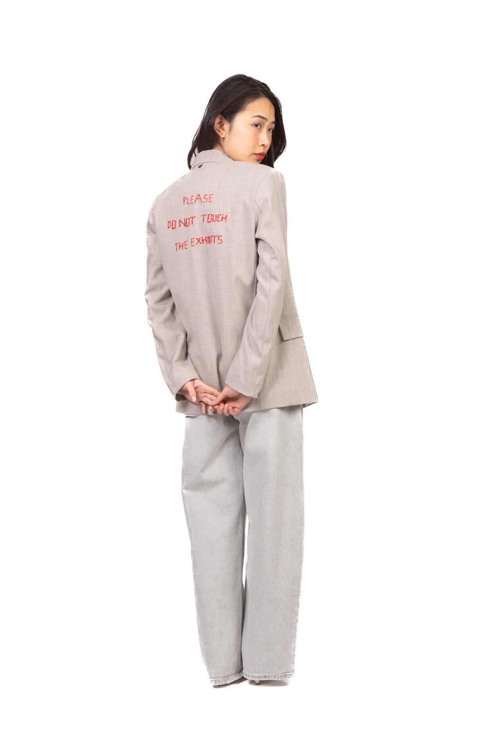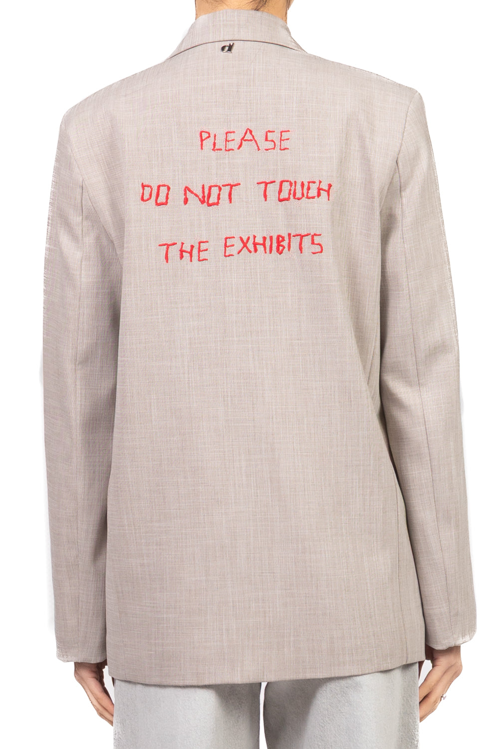 Giacca fit dritto con chiusura a due bottoni e scritta ricamata sul retro. Dotata di spalline leggermente imbottite e interno completamente foderato. Linea strutturata, vestibilità regolare e design contemporaneo con dettaglio distintivo.