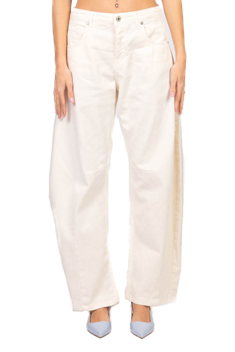 • Jeans modello barrel con chiusura a lampo e bottone e costruzione 5 tasche. Dettaglio cucitura sul ginocchio che valorizza la struttura della gamba. Vestibilità regolare, linea curva e design contemporaneo.