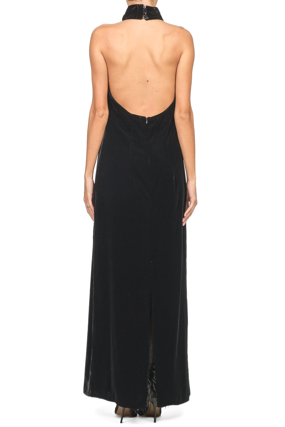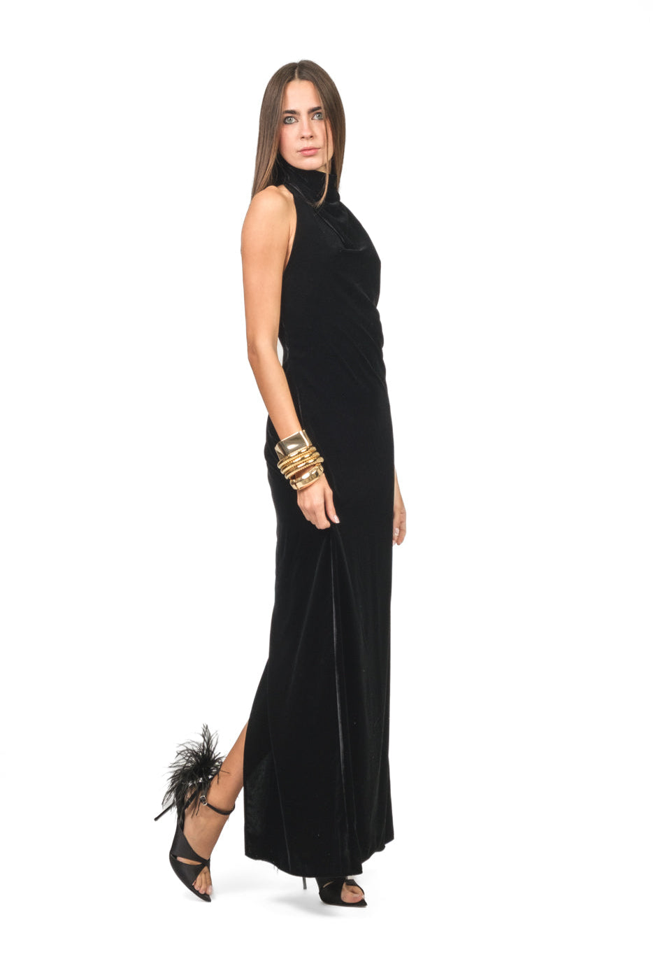 Abito in ciniglia con scollo all’americana, caratterizzato da bottoncini posteriori sul colletto e da uno scollo profondo sulla schiena. Presenta spacco posteriore per facilitare il movimento e chiusura lampo posteriore nascosta.