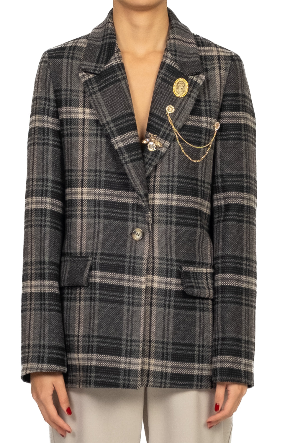• Elegante e dal gusto contemporaneo, questa giacca in misto lana presenta un raffinato motivo check che aggiunge carattere e personalità al look. Le spille applicate sul bavero donano un tocco originale, mentre la struttura con spalline leggermente imbottite e la fodera interna assicurano una vestibilità confortevole e definita. La chiusura a un bottone e le tasche frontali completano il design con equilibrio e stile.