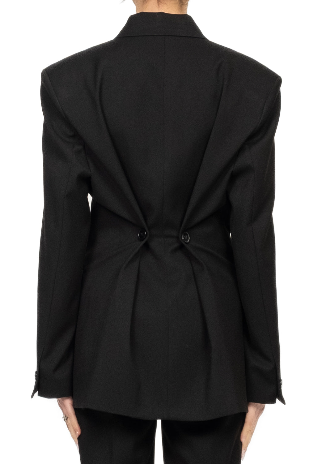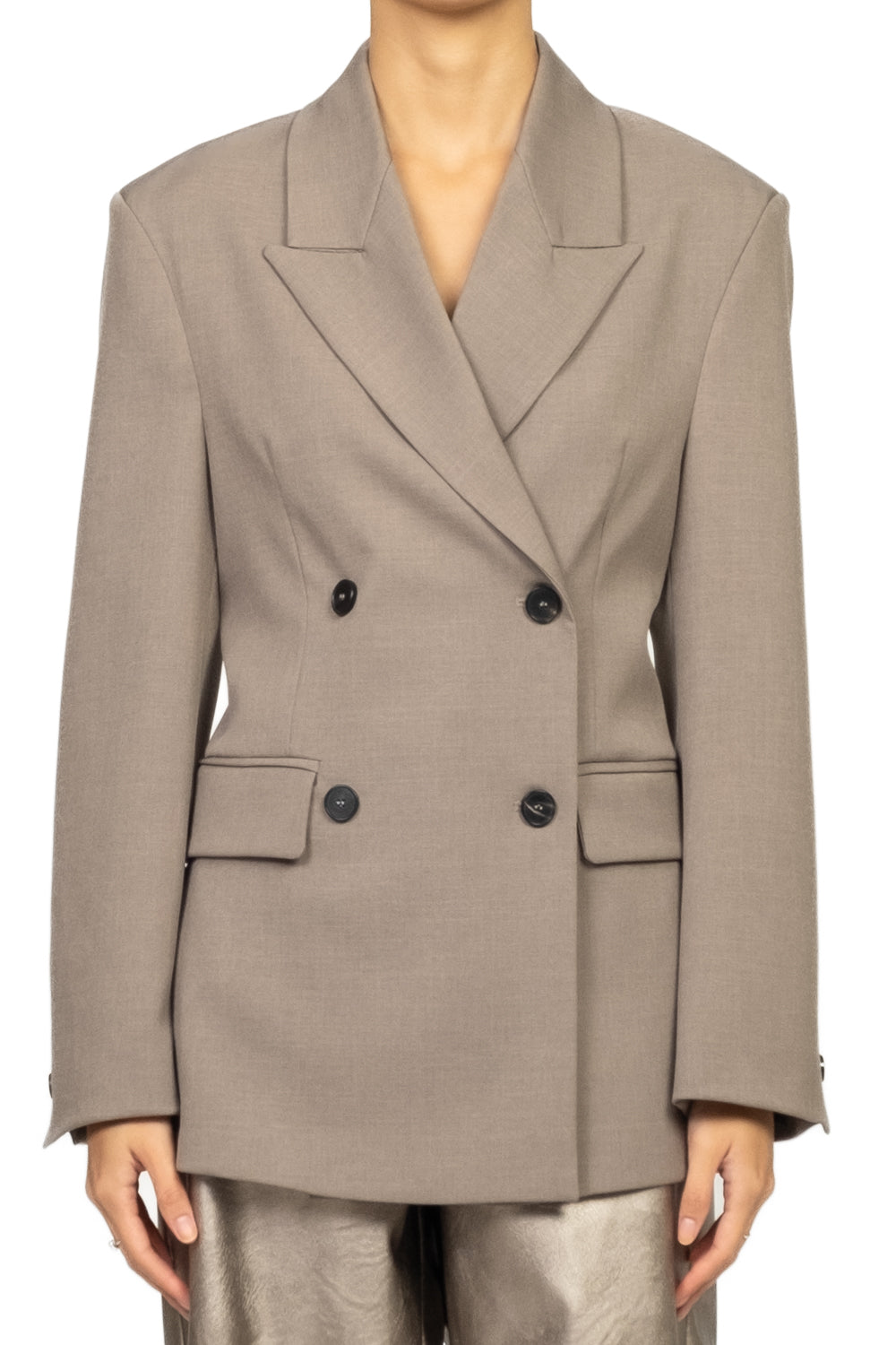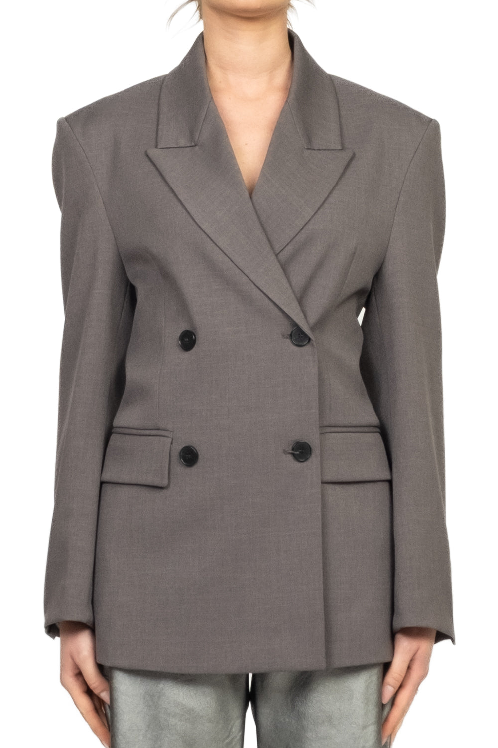 • Giacca doppiopetto sfiancata con spalline imbottite e bottoni sul retro. Foderata internamente, linee strutturate per un look elegante e contemporaneo.