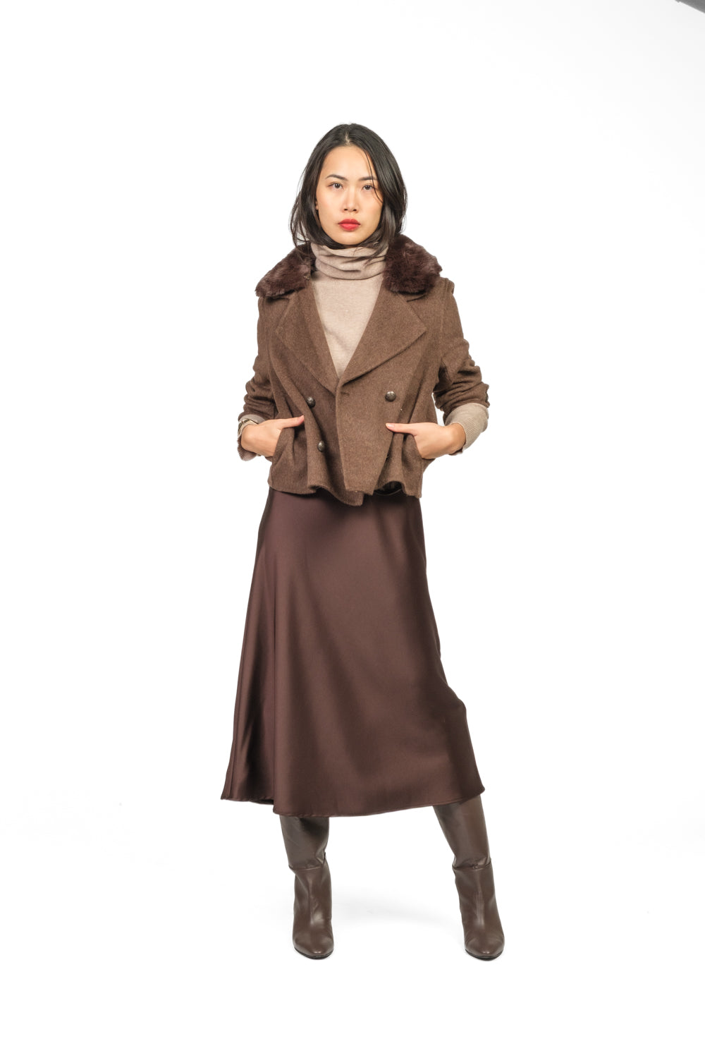 Giacca cappotto doppio petto in panno, con collo in eco pelliccia removibile e tasche a filo frontali. Linea elegante e strutturata, perfetta per look invernali raffinati e contemporanei.