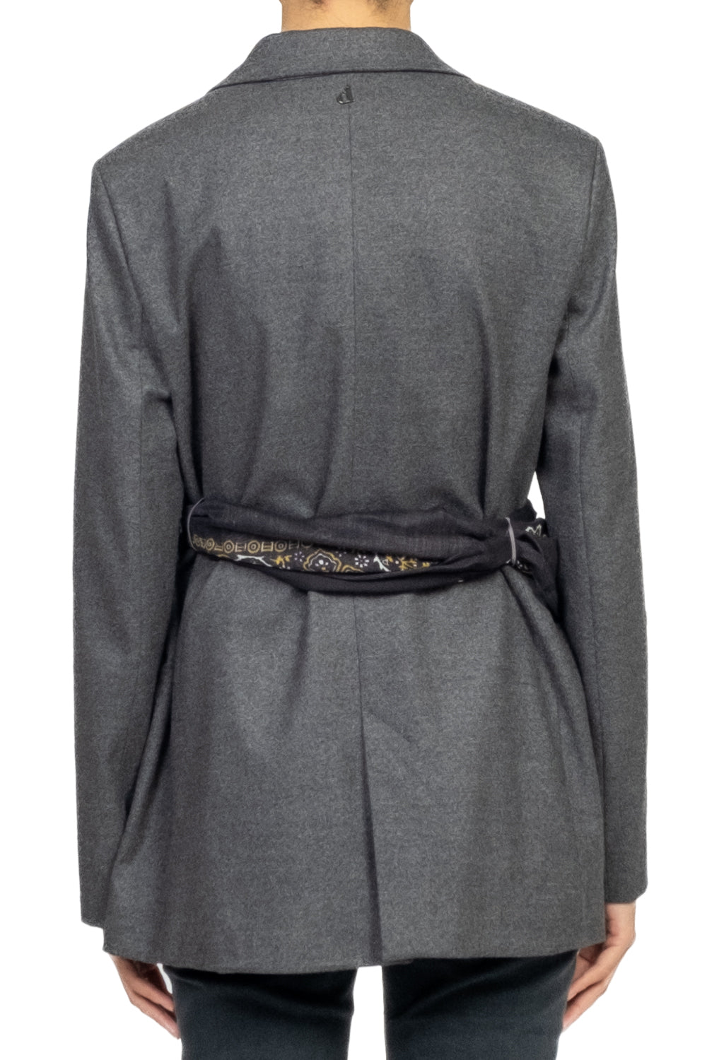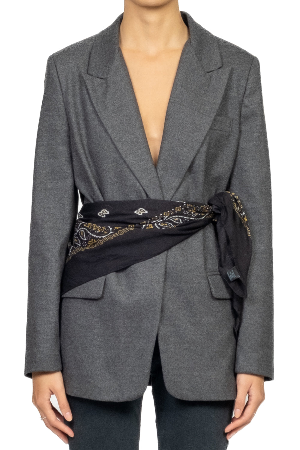 • Giacca monopetto leggermente lunga con foulard bandana in vita e spalline imbottite. Foderata internamente, con spacchetto posteriore, linea elegante e moderna per un look femminile e definito.