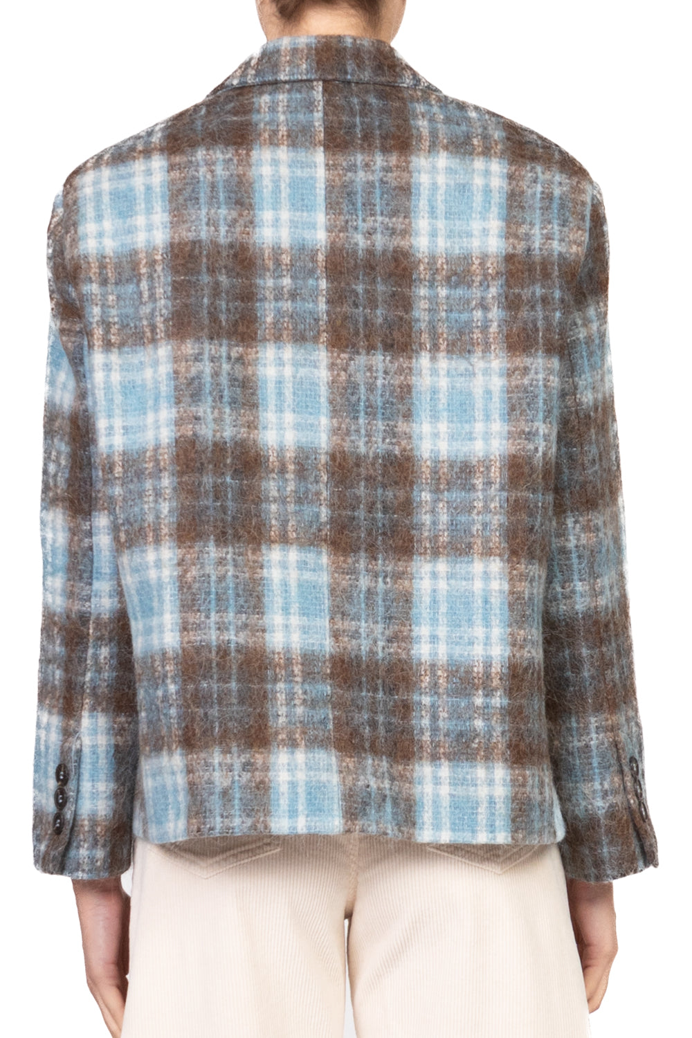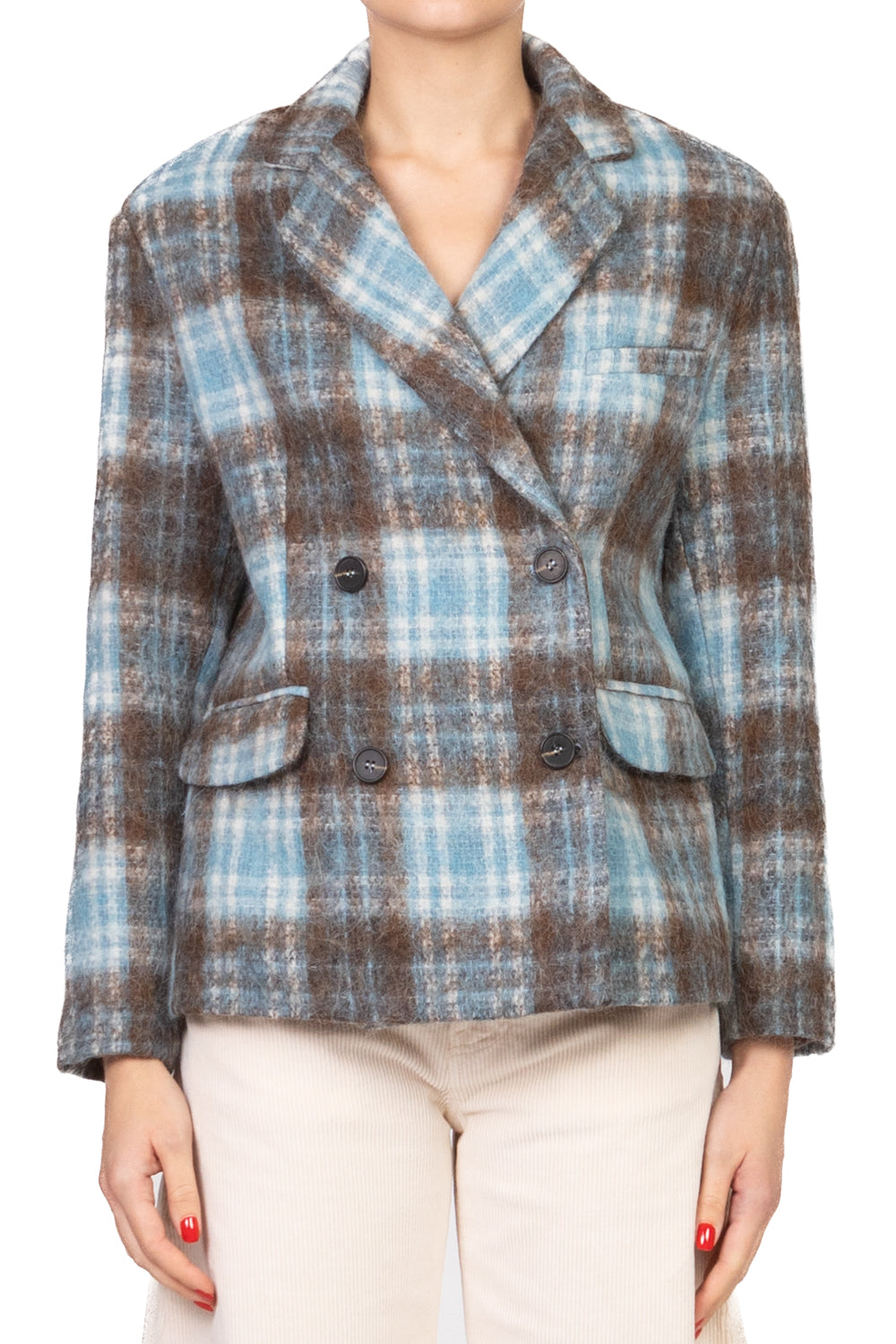 • Giacca over doppiopetto in misto lana con motivo check, tessuto effetto peloso e interno completamente foderato. Dotata di tasche e taschini frontali, combina stile classico e comfort moderno per un look sofisticato e contemporaneo.