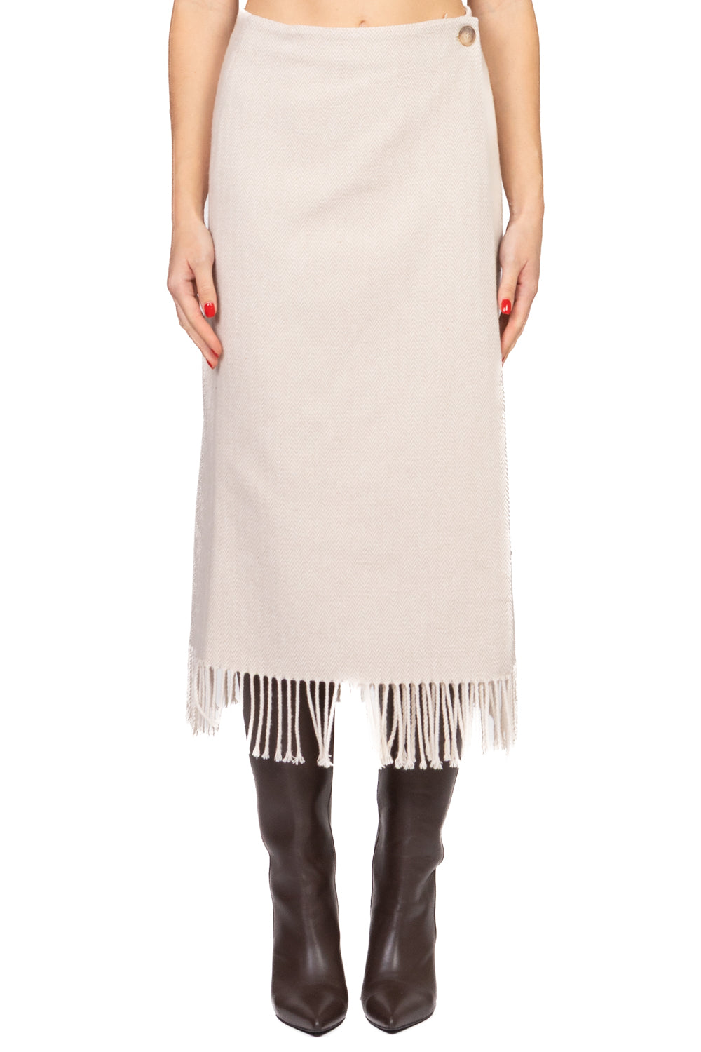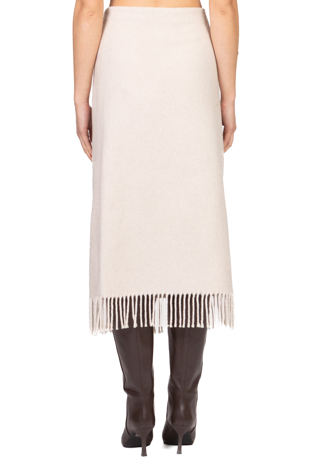 • Gonna portafoglio in tessuto doppio con trama spigata, frange sull'orlo e chiusura frontale con bottone a vista e bottone interno nascosto. Linea sofisticata e dinamica, perfetta per look eleganti e contemporanei.