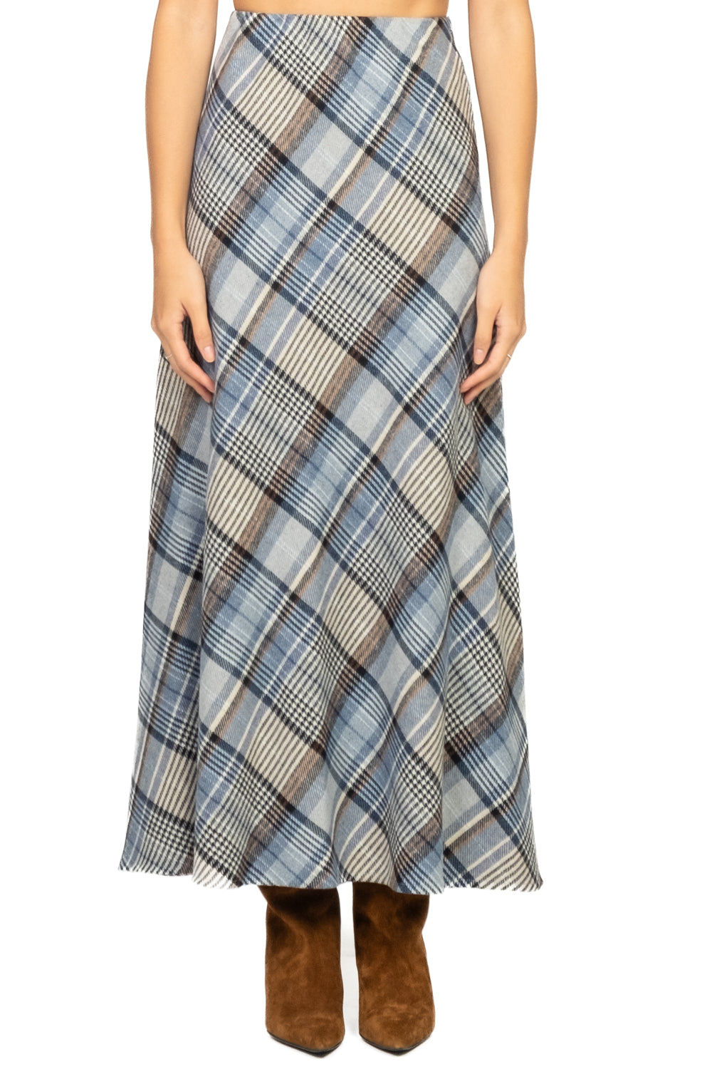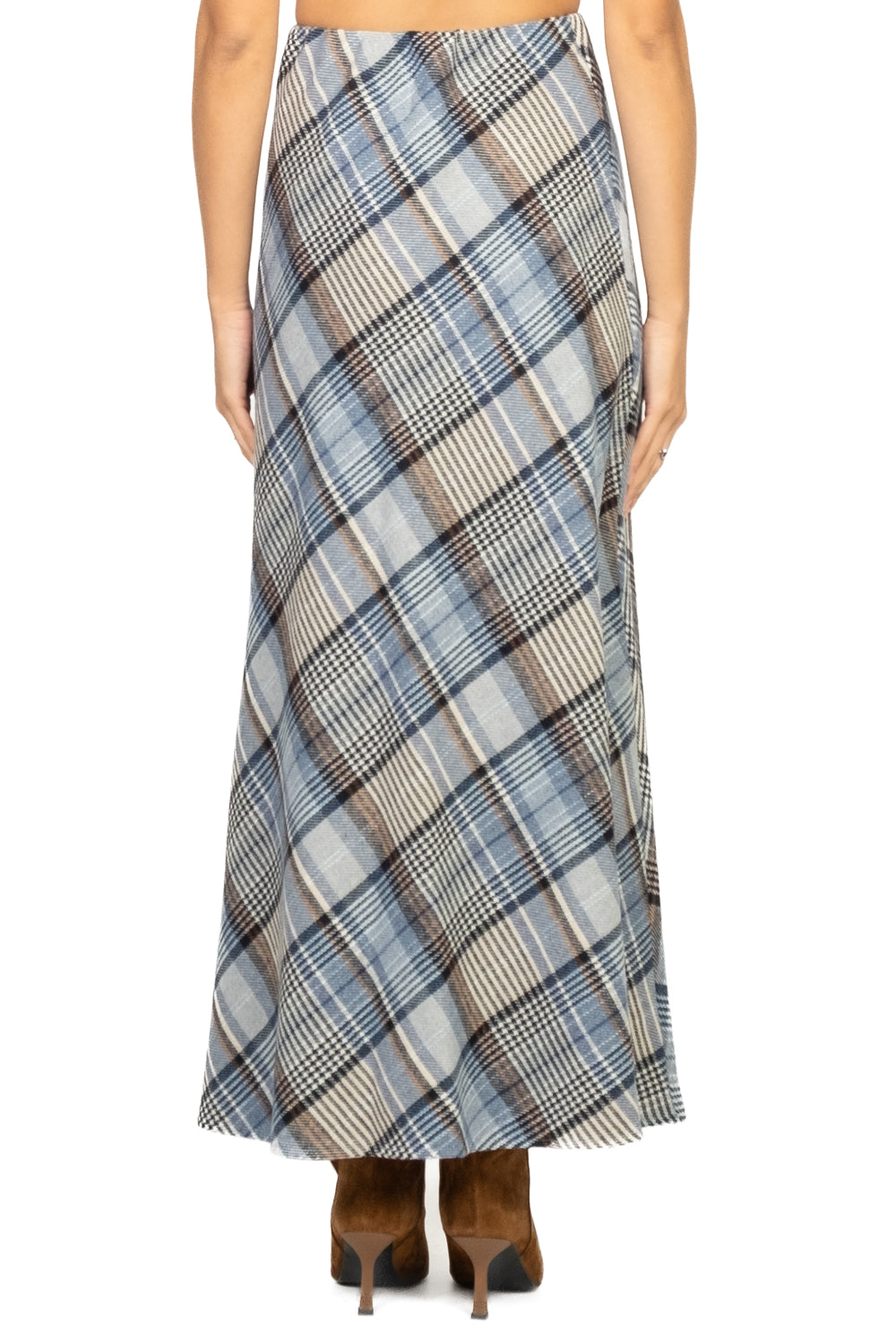 • Gonna svasata in tessuto check misto lana con elastico in vita. Senza tasche, linea morbida e femminile per un look caldo e contemporaneo.