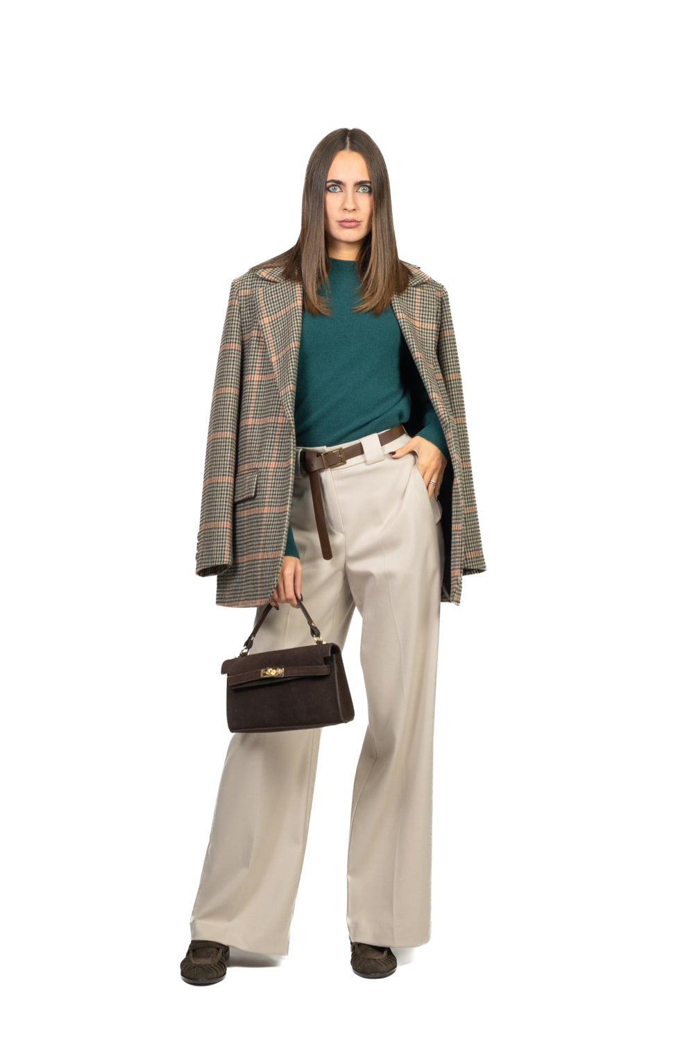 Pantalone a gamba dritta con cintura coordinata, elastico posteriore in vita, tasche laterali e chiusura con zip e bottone. Versatile e comodo, perfetto per look eleganti o casual.