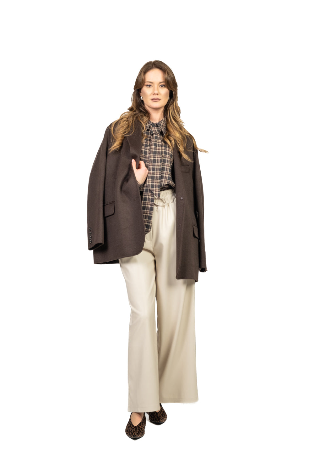 Dal taglio ampio e moderno, questo pantalone palazzo è realizzato in ecopelle per un effetto sofisticato e contemporaneo. La coulisse in vita garantisce comfort e vestibilità regolabile, mentre le tasche a filo e la patta finta aggiungono dettagli eleganti e minimalisti.