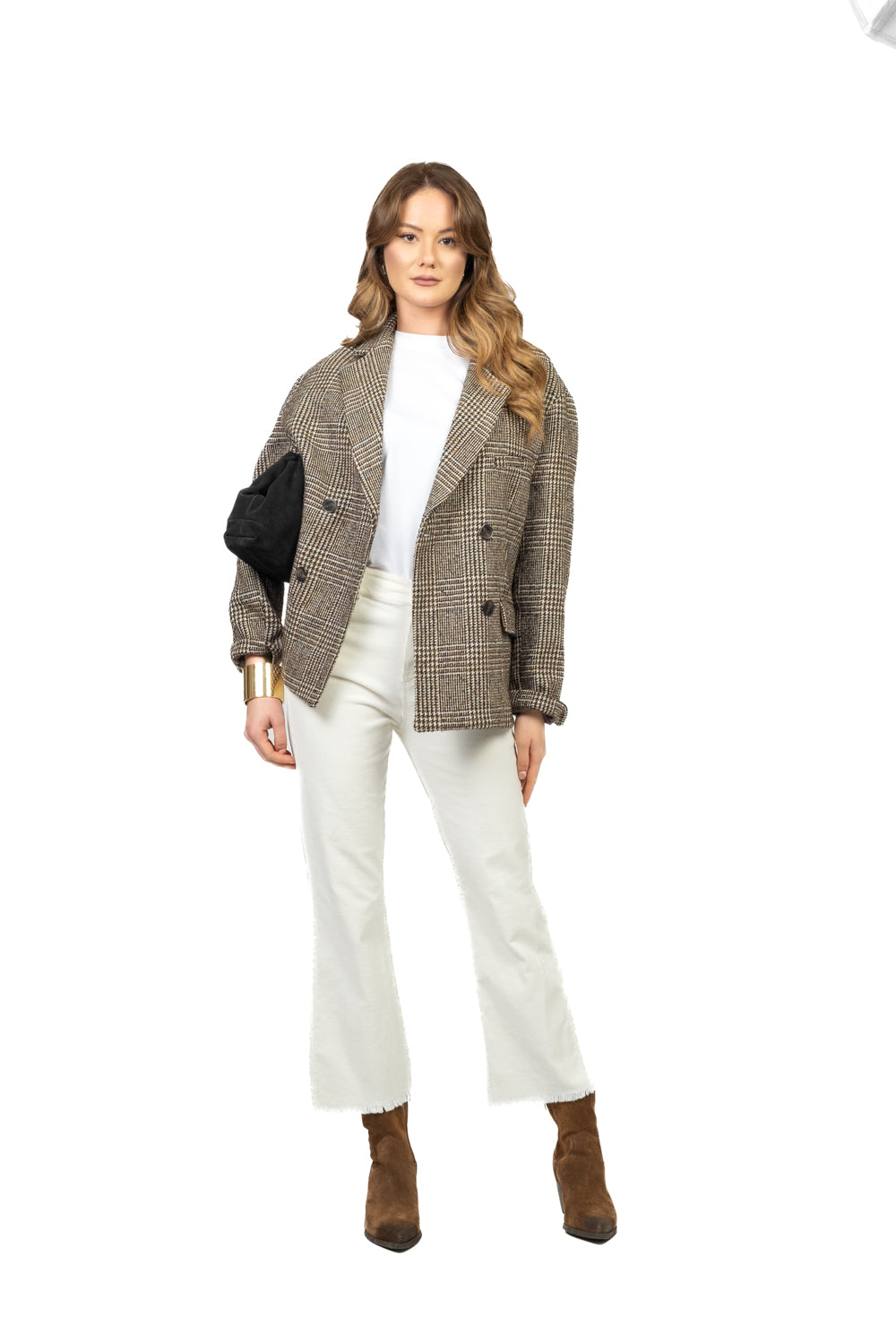 Pantalone a trombetta realizzato in velluto millerighe, con orlo sfrangiato per un dettaglio contemporaneo. Dotato di cinque tasche funzionali e chiusura frontale con zip e bottone. Un capo versatile che unisce eleganza e stile moderno, perfetto per look casual-chic o da sera.