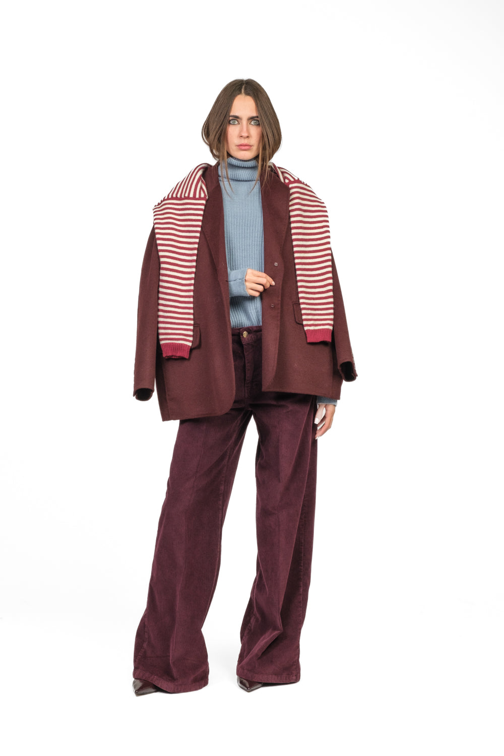 • Pantalone palazzo in velluto a coste, con chiusura frontale a lampo e bottone oro. Struttura a 4 tasche e linea ampia per un look caldo, elegante e contemporaneo.