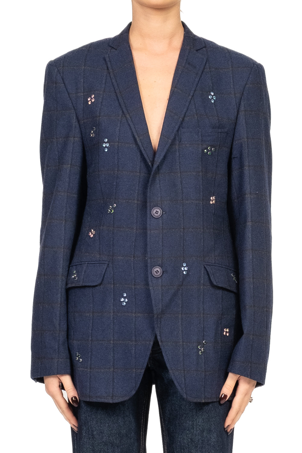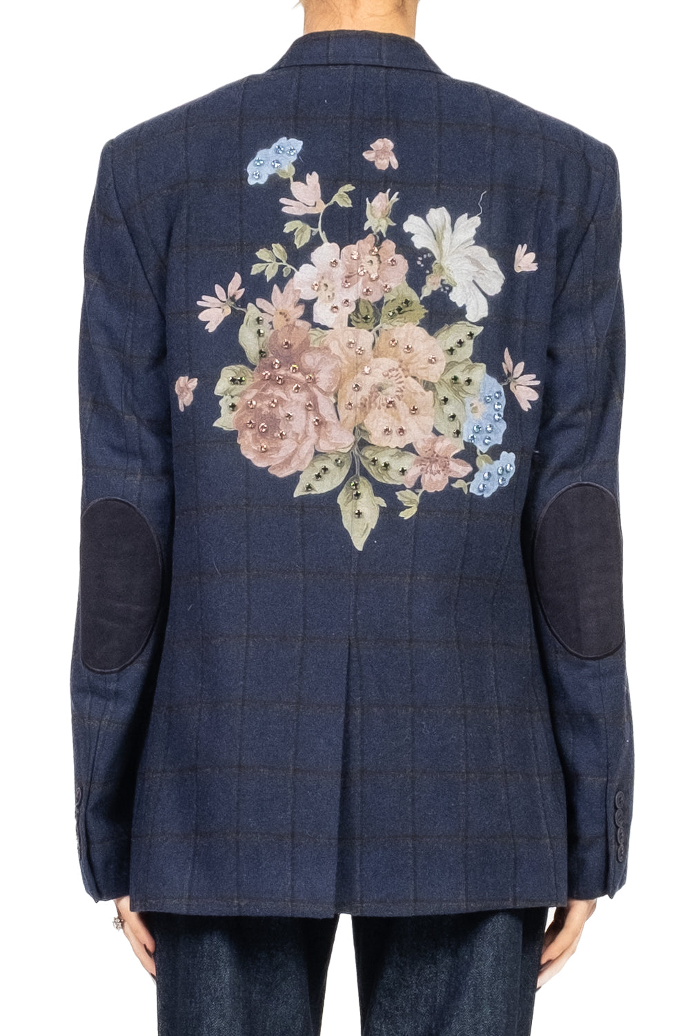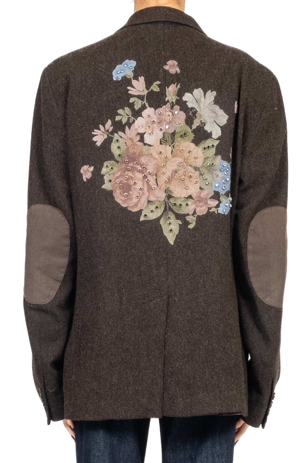 Giacca vintage con spalline leggermente imbottite e applicazioni frontali in strass che donano luce e glamour al capo. La stampa posteriore arricchita da strass e le toppe sui gomiti aggiungono un tocco di carattere e originalità, rendendola perfetta per chi ama distinguersi con stile.