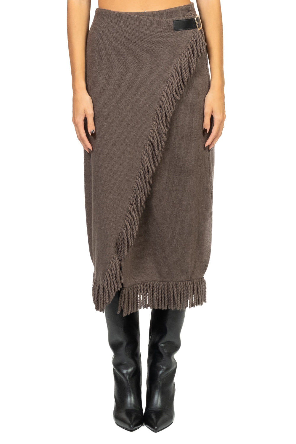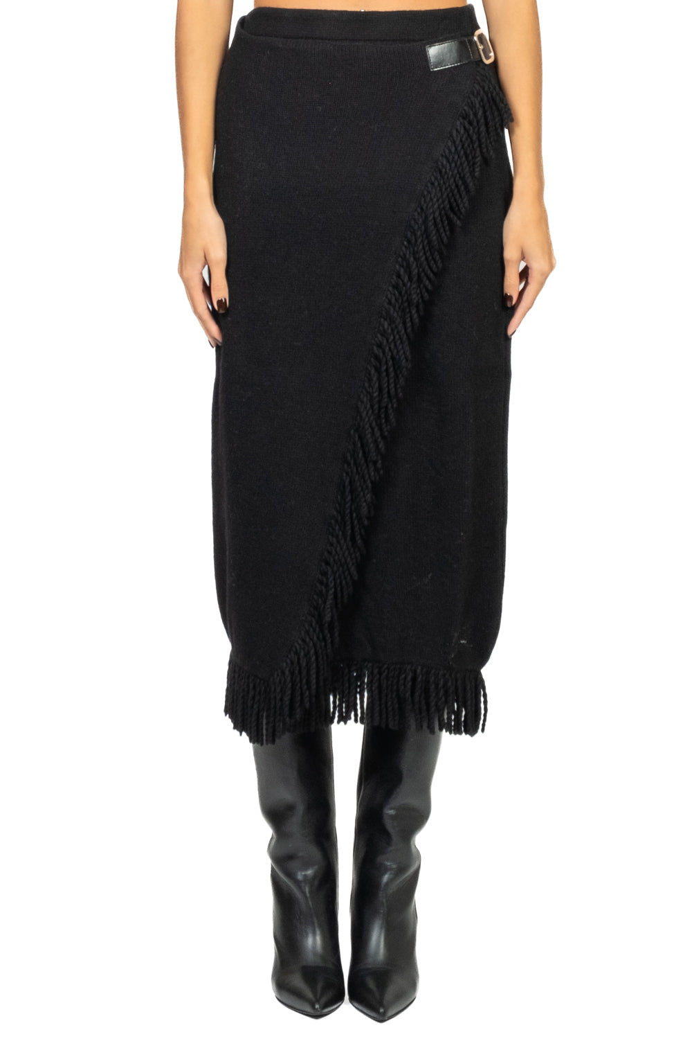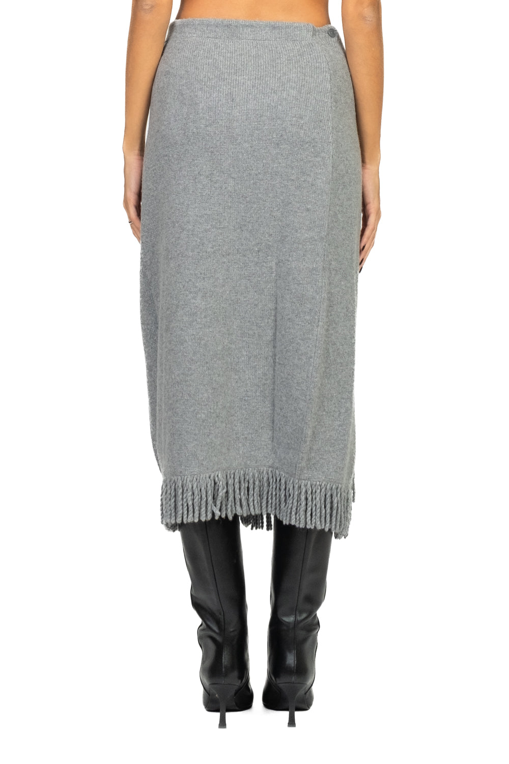 • Elegante e versatile, questa gonna in maglia presenta un design raffinato con chiusura a cinturino laterale e bottone sul lato opposto. Il bordo a frange aggiunge un dettaglio di stile dinamico, mentre l’elastico in vita garantisce comfort e vestibilità perfetta.