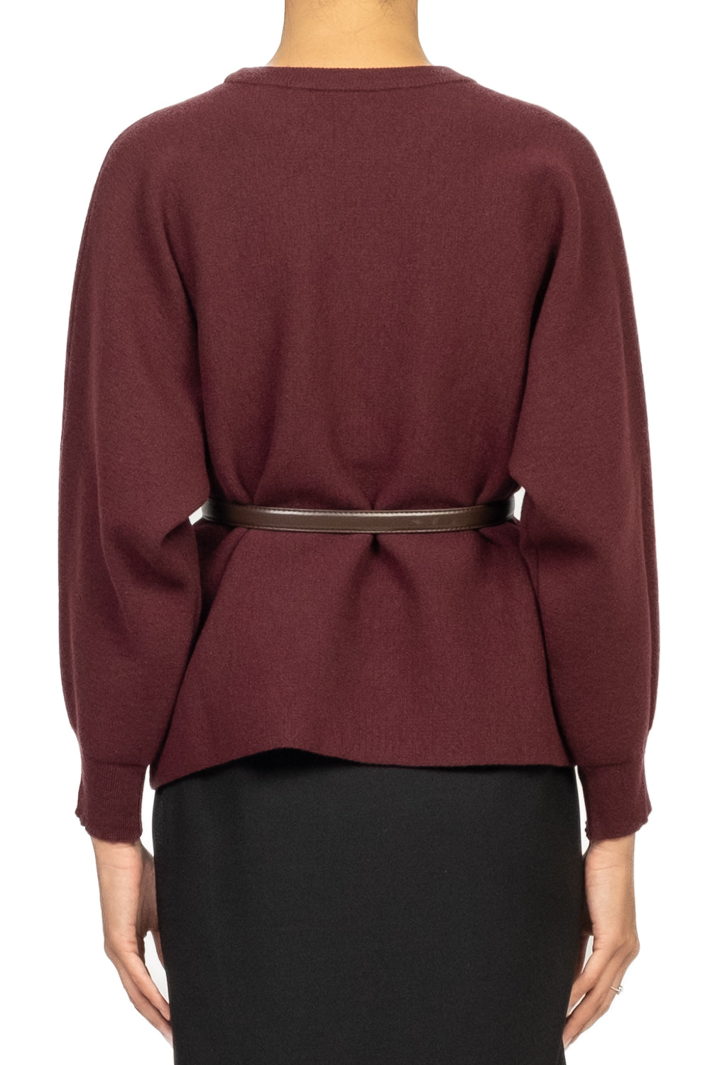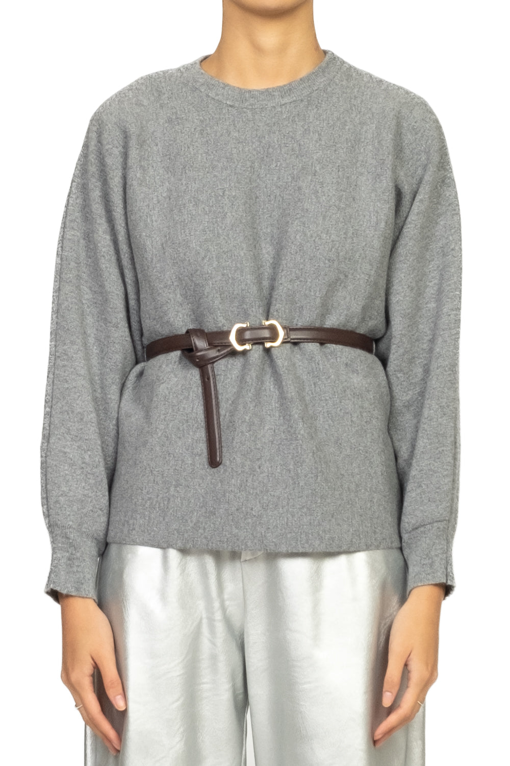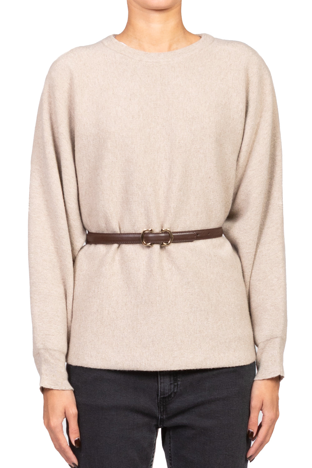 Un capo dal fascino raffinato e contemporaneo: questa maglia girocollo unisce la morbidezza del tessuto al volume romantico delle maniche a palloncino. La cintura, da inserire nelle eleganti asole laterali, definisce la silhouette e aggiunge struttura al design. Perfetta da abbinare a pantaloni sartoriali o gonne midi per un look femminile e impeccabile.