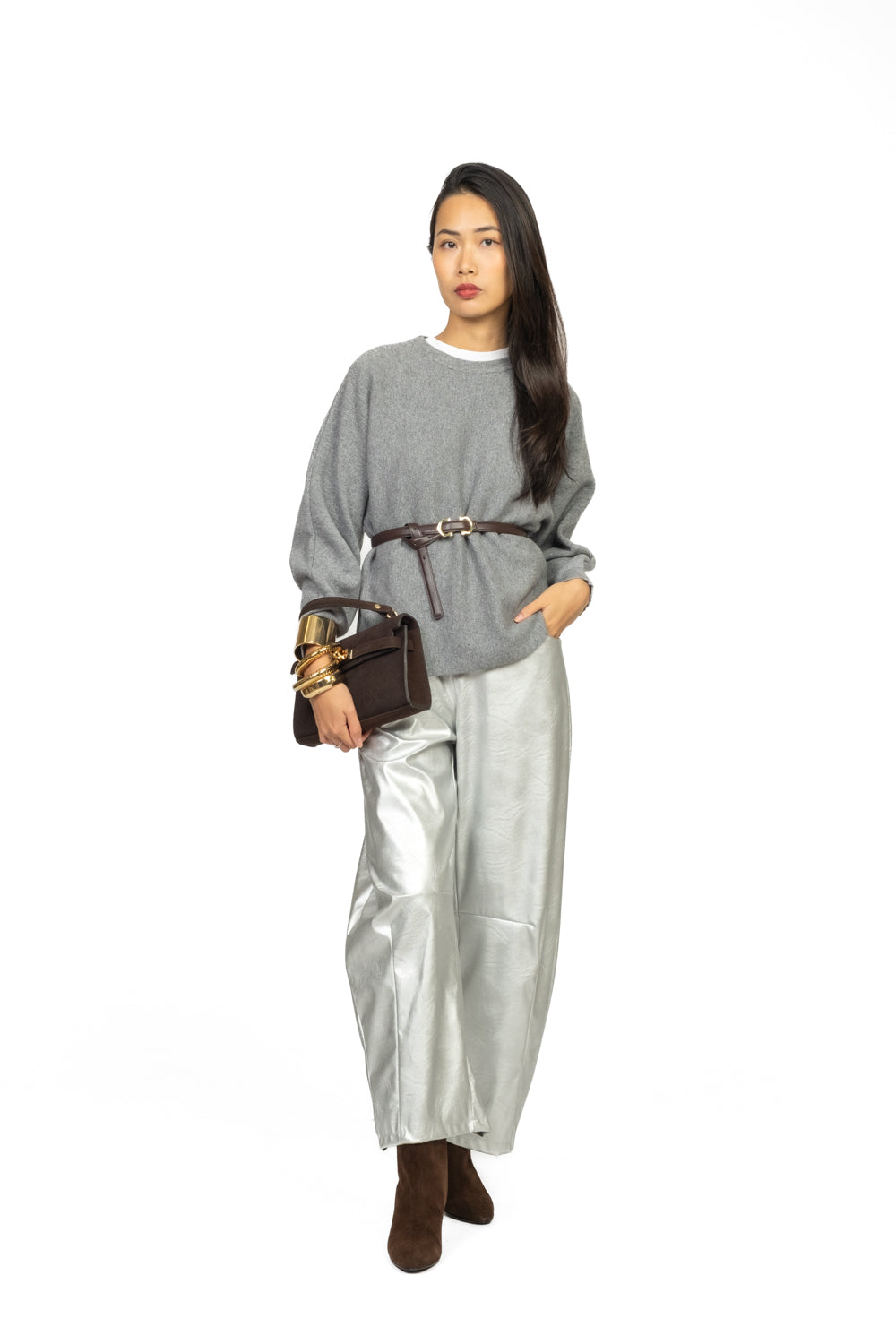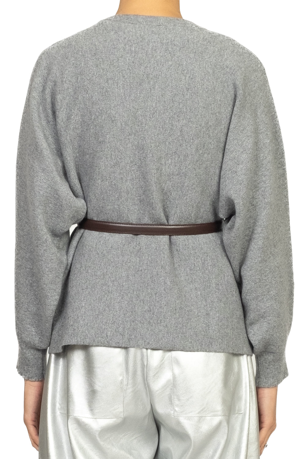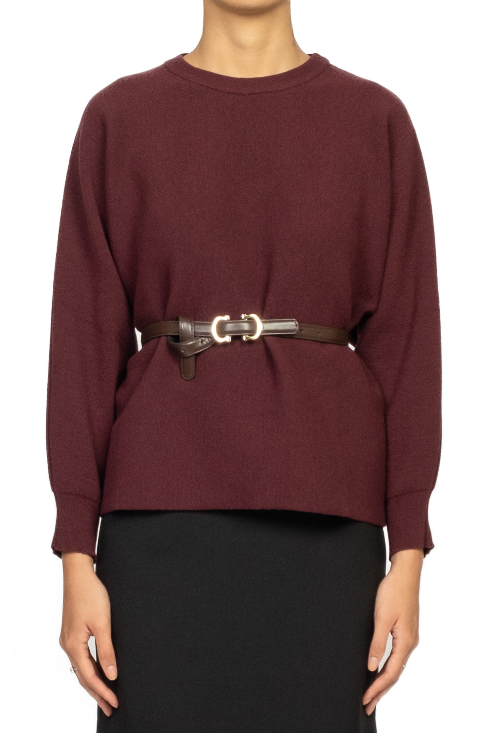 Un capo dal fascino raffinato e contemporaneo: questa maglia girocollo unisce la morbidezza del tessuto al volume romantico delle maniche a palloncino. La cintura, da inserire nelle eleganti asole laterali, definisce la silhouette e aggiunge struttura al design. Perfetta da abbinare a pantaloni sartoriali o gonne midi per un look femminile e impeccabile.
