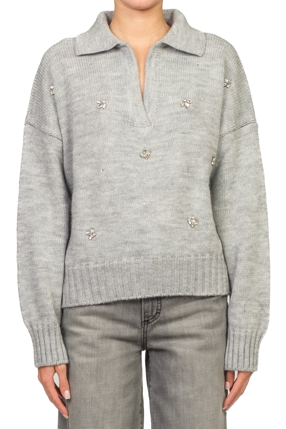 Maglia polo senza bottoni, impreziosita da applicazioni gioiello frontali sparse. Vestibilità comoda e linee pulite, perfetta per aggiungere un tocco elegante a look casual o raffinati.